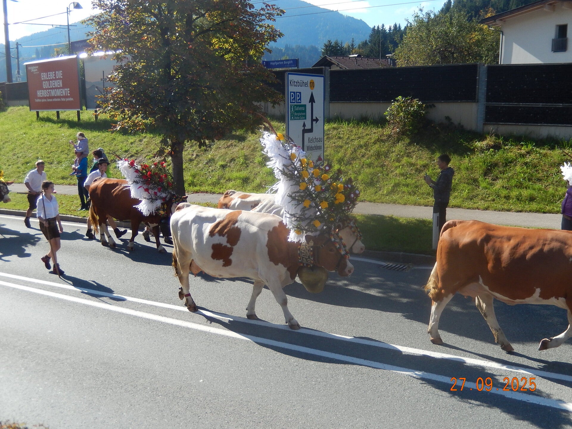 Ce samedi, nous avons eu le plaisir de visiter le pittoresque village de Hopfgarden, où se déroulait la traditionnelle transhumance des vaches revenant des alpages. Le spectacle était enchanteur : les animaux, somptueusement ornés de décorations florales, défilaient tout au long de la matinée, offrant un véritable tableau vivant.